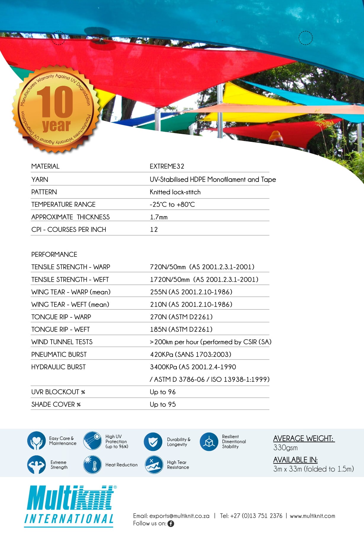 Factores de sombra entre 80% y 95% y bloqueo de rayos UV de entre 85% y 97%, comparable a 20 FPS según norma Chilena. Viene en rollos de 33 x 3 mts.